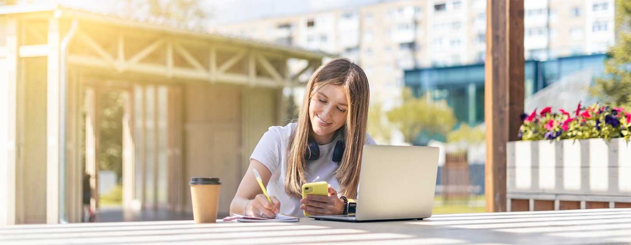 Female student sitting working on her laptop at a table. Female student sitting working on her laptop at a table.