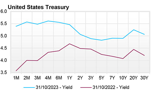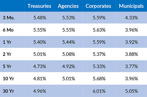 The U.S. Treasury Yield Curve remains inverted, however this inversion has begun flattening somewhat, with the 10-year yield at 4.51%, 36 basis points below the 2-year yield of 4.87%. The U.S. Treasury Yield Curve has now been inverted for 15+ months. At its recent September meeting, the FOMC left the Federal Funds target rate range at 5.25% - 5.50%. The FOMC kept rates in this band in its October/November meeting. The three-month and six-month U.S. Treasury Bills currently yield in a range of 5.40%-5.49%, which is within the range of the FOMC’s current Fed Funds rate target.