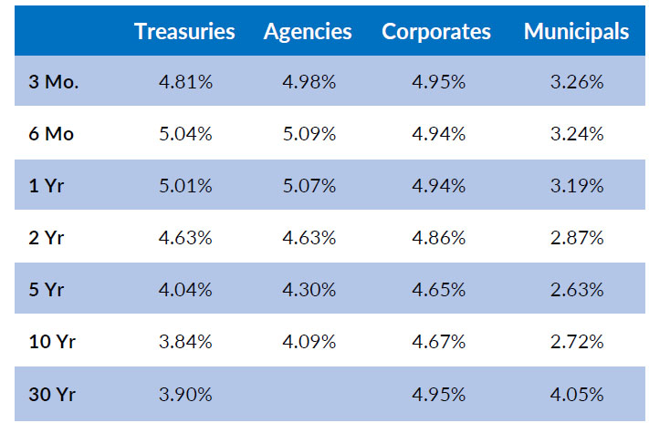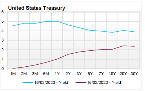 The U.S. Treasury Yield Curve remains inverted, with the 10-year yield trading at 3.78%, 86 basis points below the 2-year yield of 4.64%. At the most recent Federal Reserve Open Market Committee meeting ended February 1st, the Federal Funds Rate range was increased by 0.25%, to 4.50% to 4.75%. In terms of commentary, the FOMC said “the Committee anticipates that ongoing increases in the target range will be appropriate in order to attain a stance of monetary policy that is sufficiently restrictive to return inflation to 2% over time.” The FOMC also said that “In determining the extent of future increases in the target range, the Committee will take into account…….the lags with which monetary policy affects economic activity and inflation.” Finally, the FOMC reiterated that “the Committee is strongly committed to return inflation to its 2% objective.” The next FOMC meeting is in late March. Post the most recent meeting, the 6-month U.S. T-bill yield has exceed 5.00% for the first time since 2007.
