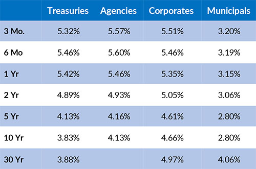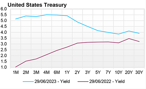 The U.S. Treasury Yield Curve remains inverted, with the 10-year yield trading at 3.84%, 105 basis points below the 2-year yield of 4.89%. At its recent June meeting, the FOMC kept the Federal Funds target rate unchanged at a range of 5.00% -5.25%. The minutes of this meeting reflect that the FOMC remains strongly committed to keeping inflation down near 2% per year while maintaining full employment. The FOMC continues to imply that they will increase interest rates one or more two times this year. The three-month and six-month U.S. Treasury Bills currently yield in a range of 5.31%-5.44%, which now imply a higher probability of a rate hike at the July Fed meeting.