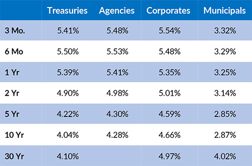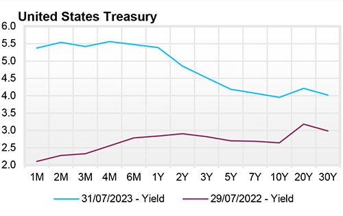 The U.S. Treasury Yield Curve remains inverted, with the 10-year yield trading at 4.09%, 82 basis points below the 2-year yield of 4.91%. At its recent July meeting, the FOMC increased the Federal Funds target rate by 25 basis points from 5.25 - 5.50. The minutes of this meeting reflect that the FOMC remains strongly committed to keeping inflation down near 2% per year while maintaining full employment. The three-month and six-month U.S. Treasury Bills currently yield in a range of 5.40%-5.50%, which now imply a higher probability of a rate hike at the next Fed meeting in September.