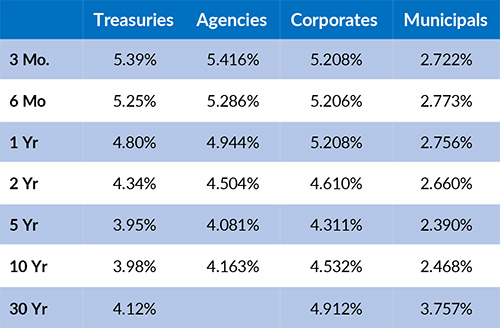 The U.S. Treasury Yield Curve remains inverted; however, this inversion has continued to remain somewhat flatter, with the 10-year yield at 3.92%, 42 basis points below the 2-year yield of 4.34%. The U.S. Treasury Yield Curve has now been inverted for 17 months. At its recent meeting, the FOMC left the Federal Funds target rate range at 5.25% - 5.50%. The FOMC also removed language that implied future interest rate increases and introduced language that implied future interest rate cuts. The FOMC also noted that the U.S. Unemployment Rate will likely continue trending higher to the 4.1% level. The three-month and six-month U.S. Treasury Bills currently yield in a range of 5.25%-5.38%, which is within the range of the FOMC’s current Fed Funds rate target. The one-year U.S. Treasury Bill is now yielding 4.80%, slightly below the target rate in anticipation of a future interest rate cut.
