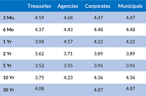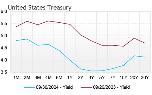 The current federal funds target rate is 4.75-5.00%. Short-duration bond rates along the U.S. Treasury Yield Curve continue to fall as the FOMC enacted a 50 bps rate cut in September. Since the announcement, long-duration bonds have edged slightly higher, as expectations of a rate cut had been fully priced before the meeting. The spread between the 10-year and 2-year Treasury rate continues to normalize, historically a sign of stable economic conditions. Market participants are attentive to how the FOMC will manage expectations following a large initial rate cut. Futures markets are split on whether the November meeting will result in a 50 bps or 25 bps rate cut. The next FOMC meeting is scheduled for November 6-7, 2024.