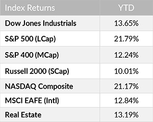 Year to date, the best performing sectors have been Information Technology (+29.63%), Communication Services (+27.88%), and Utilities (+27.45%). The worst performing sectors this year have been Energy (+5.69%), Real Estate (+11.48%), and Materials (+12.62%). On a total return basis, the Russell 1000 Growth Index has increased 24.55% year to date, while the Russell 1000 Value Index has returned 16.68% over the same period.