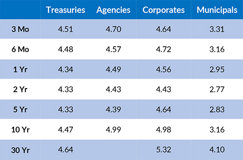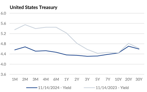 The current federal funds target rate was lowered to 4.50-4.75%, following a 25 bps cut at the November FOMC meeting. The 10-year yield is currently 4.47%, 14 basis points above the 2-year yield of 4.33%. The U.S. Treasury yield curve continues to flatten as ultra-short duration bond yields fall. However, bonds along the rest of the yield curve remain elevated from the lows seen in mid-September. While yields often rise in the two months following the first rate cut, the current cycle has demonstrated the second-largest absolute increase in yields going back to 1970. The next FOMC meeting is scheduled for December 17-18, 2024. Futures markets are currently split on whether to expect a 25 bps rate cut or a pause at the next meeting.