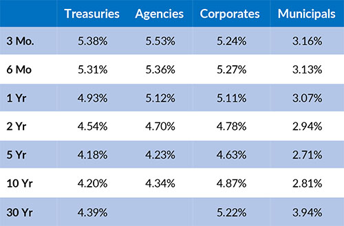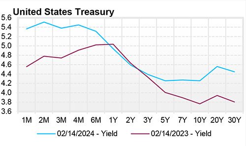 The U.S. Treasury Yield Curve remains inverted; however, this inversion has continued to remain somewhat flat, with the 10-year yield at 4.29%, 37 basis points below the 2-year yield of 4.66%. The U.S. Treasury Yield Curve has now been inverted for 19 months. At its recent meeting in late January, the FOMC left the Federal Funds target rate range at 5.25% - 5.50%. During Jerome Powell's speech at the January meeting, he emphasized that the Federal Reserve is moving closer to cutting interest rates. However, he also stated it was unlikely that rate cuts would begin in March. U.S. T-bills do not trade solidly at 5.00% (below the lower end of the FOMC’s Fed Funds Rate Range) until late November 2024, which is a good guess at a date for a possible rate cut.