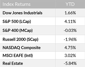 Stocks have continued to rally in 2024, with the S&P 500 up 3.84% year-to-date. The S&P 500 briefly rose above 5,000 for the first time in history during the second week of February. The leading sectors for the year are Communication Services (+10.15%), Information Technology (+7.60%), and Health Care (+4.70%). The sectors with largest drawdowns this year include Real Estate (-6.21%), Utilities (-5.57%), and Materials (-3.54%).