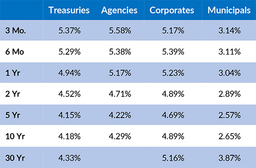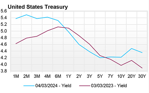 The U.S. Treasury Yield Curve remains inverted; however, this inversion has continued to remain somewhat flat, with the 10-year yield at 4.19%, 34 basis points below the 2-year yield of 4.53%. The U.S. Treasury Yield Curve has now been inverted for 19-20 months. At its recent meeting in late January, the FOMC left the Federal Funds target rate range at 5.25% - 5.50%. During Jerome Powell's speech at the January meeting, he emphasized that the Federal Reserve is moving closer to cutting interest rates. However, he also stated it was unlikely that rate cuts would begin in March. U.S. T-bills do not trade solidly at 5.00% (below the lower end of the FOMC’s Fed Funds Rate Range) until late November 2024, which is a good guess at a date for a possible rate cut.