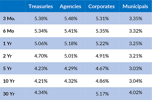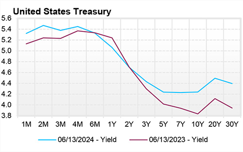 The U.S. Treasury Yield Curve remains inverted; however, this inversion has continued to remain somewhat flat. The 10-year yield is currently 4.20%, 48 basis points below the 2-year yield of 4.68%. The U.S. Treasury Yield Curve has now been inverted for 23 months. Rates across the yield curve have fallen over the past month. Following a rate cut from the Bank of Canada earlier this month, the European Central Bank cut its benchmark rate to 3.75%. This marks the first two G7 Countries to cut rates during this cycle. On June 12, the FOMC board voted unanimously to keep the Fed Funds target rate range at 5.25% to 5.50. During the June meeting, FOMC members forecasted an average of 1 rate cut by the end of the year. This differs from the members’ average forecast of 3 rate cuts in 2024 during the previous meeting.
