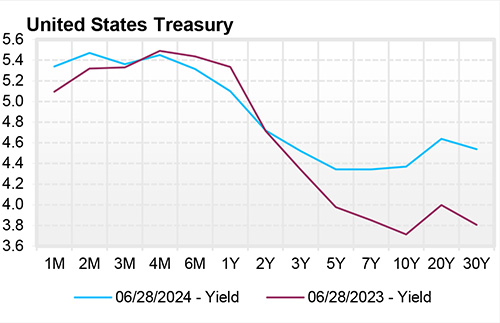 The U.S. Treasury Yield Curve has been inverted since July 2022, one of the longest inversions on record in the modern era, as the Fed has kept target rate range at 5.25 to 5.50. Roughly 65% of the market bond and futures market is positioned for a Fed rate cut in September, and over 60% expecting two more rate cuts by the end of the year. The FOMC members most recent dot plot from the June meeting depicted an expectation of only 1 rate cut by the end of the year. Either the bond market is wrong (again), and will have to adjust to the Fed’s outlook, or Fed is setting the US economy up for a hard landing, which the bond market has continually expected the last 18 months. During June, the 3M, 6M, 2Y, 3Y, and 10Y yields all decreased marginally, while the 5Y, 7Y, 20Y, 30Y all increased slightly, resulting in a somewhat flatter, but still inverted, curve.