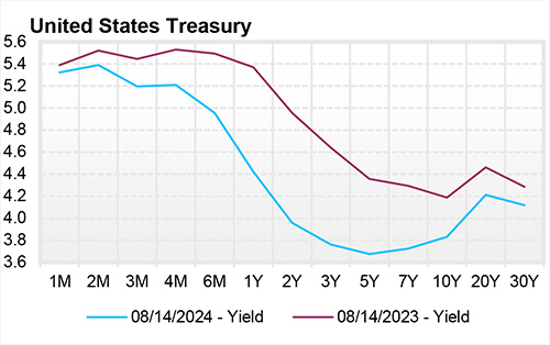 At the July FOMC meeting, members voted to keep the federal funds rate target unchanged at 5.25-5.50%. In recent weeks, many economists have publicly stated their fears that the Fed is acting too slow as it relates to cutting their target rate. After a few soft prints of economic data, rates across the Treasury yield curve dropped sharply in early August. The longest yield curve inversion in history was briefly interrupted earlier this month. The CME Fedwatch Tool currently predicts rate cuts totaling 75-100 bps by year-end. The next FOMC meeting is scheduled for September 17-18, 2024.