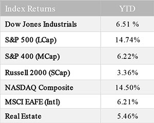 Year to date, the best performing sectors have been Information Technology (+22.86%), Communication Services (+21.54%), and Utilities (+16.81%). The worst performing sectors this year have been Real Estate (+4.30%), Materials (+4.04%), and Consumer Discretionary (+0.73%).