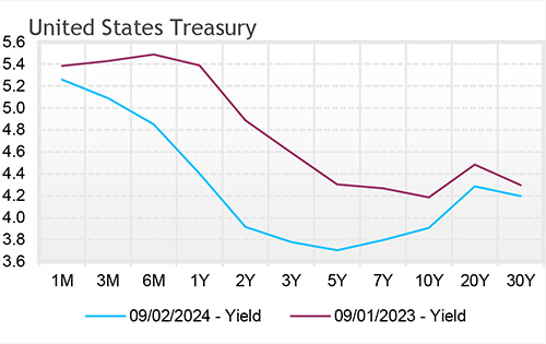 At the July FOMC meeting, members voted to keep the federal funds rate target unchanged at 5.25-5.50%. The 10-year yield is currently 3.83%, 3 basis points below the 2-year yield of 3.86%. After an inversion that lasted over 2 years, the U.S. Treasury Yield Curve has normalized for brief periods in recent weeks. Yields on short-term bonds have fallen to their lowest levels in 2024 as investors expect rate cuts in the near future. The next FOMC meeting is scheduled for September 17-18, 2024.
