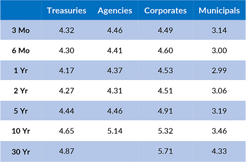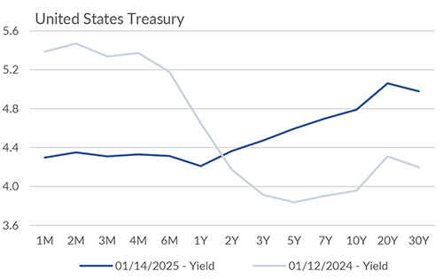 The current federal funds target rate is 4.25-4.50%. The 10-year yield is currently 4.65%, 38 basis points above the 2-year yield of 4.27%. As evidenced by the Yield Curve chart below, yields on the shorter end of the curve have fallen notably alongside FOMC rate cuts. At the same time, yields on the long end of the curve have risen steadily over the past several months. The normalized yield curve we observe today is historically a healthy sign for economic growth. As inflation concerns have grown in recent weeks, the options market now indicates a very low probability of a rate cut during the January or March FOMC meetings.