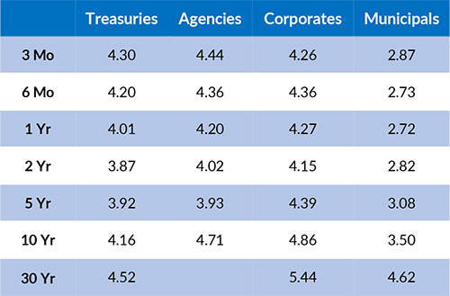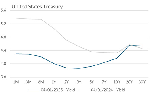 The U.S. Treasury Yield Curve remains relatively flat, with 10-year yield at 4.16%, 29 basis points below the 2-year yield of 3.87%. The current Fed Funds target range is 4.25-4.50%. Interest rates across the yield curve have continued to trend downward since a recent peak in mid-January. The next FOMC meeting is scheduled for May 6-7, 2025. Futures markets are pricing in a low probability for a May cut. The probability of a cut at the June meeting is around 60%.