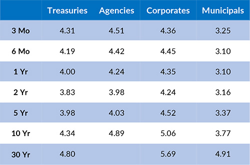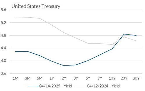 The current federal funds target rate is 4.25-4.50%. The 2-year yield is currently 3.83%, 51 basis points below the 10-year yield of 4.34%. The U.S. Treasury Yield Curve remains somewhat flat, with yields on the shorter end of the curve relatively stable following recent FOMC meetings. Yields for longer maturity bonds rose sharply in recent sessions, likely driven by inflation concerns, equity market volatility, and the potential for geopolitical restructuring. These impacts were likely exacerbated by investors raising cash, further impacting bond prices and yields. Futures markets anticipate three or four 25 bps rate cuts by year-end. The next FOMC meeting is scheduled for May 6-7, 2025.