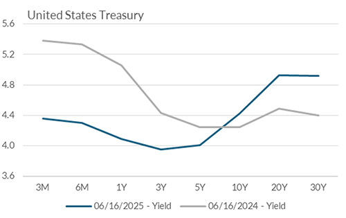 In May, the ISM Services PMI declined to 49.9, indicating a modest contraction in the services sector. The NFIB Small Business Optimism Index rose to 98.8, reflecting a slight rebound in sentiment following four consecutive monthly declines. The U.S. unemployment rate remained steady in May at 4.2%, suggesting stability in labor market conditions. The Consumer Price Index rose by 0.1% in May, bringing the annual inflation rate to 2.4%. The Producer Price Index increased by 0.1% over the same period, with the annual rate rising to 2.6%. The preliminary University of Michigan Consumer Sentiment Index rose to 60.5 in June, with improved perceptions amid easing inflation and tariff concerns. The average interest rate for a 30-year fixed-rate mortgage as of June 12 was 6.84%.