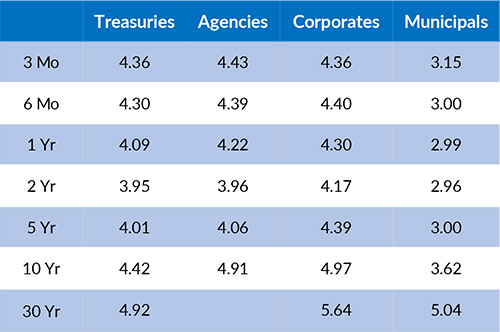 The Federal Reserve held the federal funds target rate steady at 4.25–4.50% at the May FOMC meeting, as policymakers continue to weigh mixed economic signals. The 2-year Treasury yield currently sits at 3.95%, 47 basis points below the 10-year yield of 4.42%, reflecting a modest steepening curve. Yields on both the short and long end of the yield curve have largely remained unchanged over the past month. Credit spreads remain tight relative to their long run averages, even after experiencing a run up in yields in mid-April. Futures markets now expect the target rate to be lowered by 50 bps by year-end. The next FOMC meeting is scheduled for June 17-18 where no change to the target rate is expected.